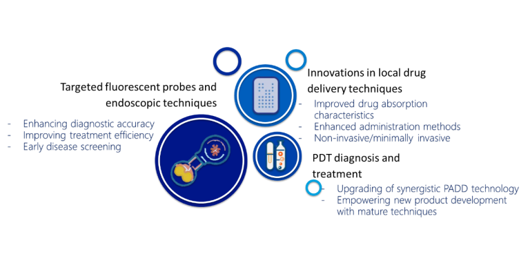The Drug Device Combination (DDC) platform is a novel medical product development platform built on the Prodrugs Accurate Drug Delivery (PADD) technology platform, leveraging the rich experience in drug development accumulated since its establishment, combined with expertise in drug delivery and medical device development. By utilizing local drug delivery technology, diagnostic or therapeutic drugs can be delivered to the target site, reducing systemic drug exposure, thus improving the safety and efficacy of diagnosis/treatment. In terms of device design, the company fully utilizes its technical reserves and conducts research on functional modules such as targeted fluorescent probes, computer image algorithm combined with endoscopy technology, photodynamic therapy (PDT) integration, and innovative local drug delivery technology. The platform aims to design devices for local drug delivery/drug activation and improved drug dosage forms/administration methods based on human anatomy and physiological characteristics, in order to optimize treatment efficacy while reducing inconvenience and trauma to patients, and enhance compliance. Products are developed based on accumulated research and mature technologies to significantly shorten the development cycle and reduce development costs, thus significantly improving competitiveness in the market, compared to conventional innovative drug development approaches alone.