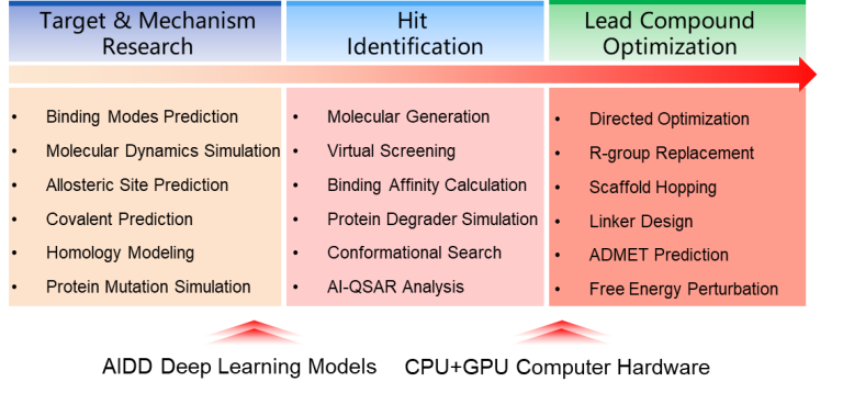 1. AI technology permeates the entire chain of target-based preclinical drug discovery, significantly improving computational efficiency and expanding the chemical space of molecular design with deep learning models.