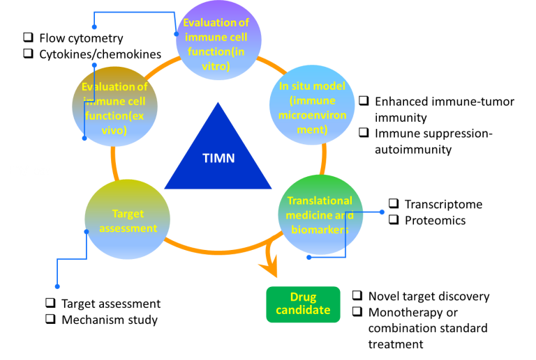 The Targeted Immunomodulation Normalization (TIMN) Platform is designed for developing new drugs for cancer immunotherapy and autoimmune diseases. This platform targets immune-related functional proteins and the immune microenvironment. It integrates target discovery, drug screening , efficacy evaluation, mechanism of action, and translational research to form a comprehensive end-to-end drug discovery system. This TIMN platform can be used to discover drugs that enhance the immune system to normalize the tumor immune microenvironment for anti-tumor treatment and drugs that negatively regulate the immune system to normalize the release of pro-inflammatory factors for treating autoimmune diseases.